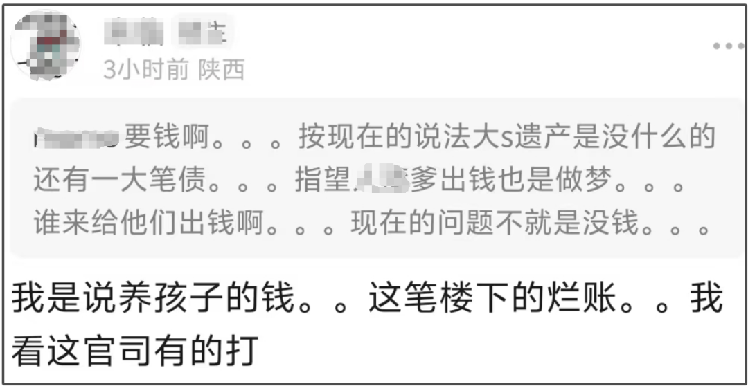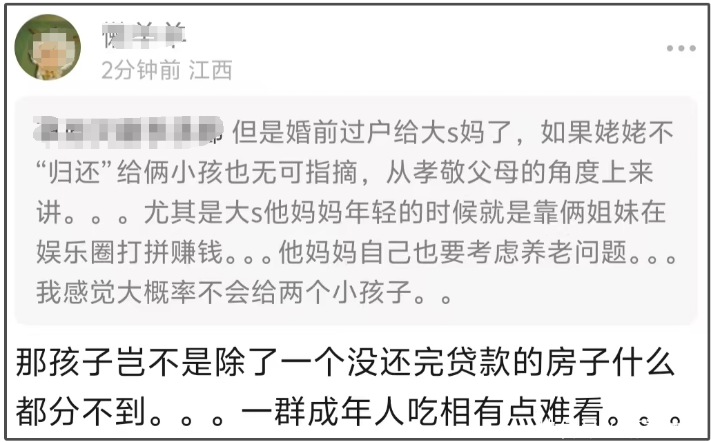 大S生前把豪宅转到了妈妈黄春梅名下,可是房贷没还完,S妈妈眼见着不想自己还,一心追着前女婿汪小菲要,汪小菲早就不想当徐家的血包,台北资产都变卖了,如果S妈妈要不到钱还房贷,大S生前房产就要被拍卖,搞不好到了最后,孩子不仅没有遗产继承,还要继承债务。